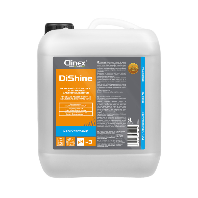 Clinex Dishine to wysokiej jakości nabłyszczacz, który zapewnia perfekcyjny połysk naczyń po myciu w zmywarce. Eliminuje zacieki i osady, pozostawiając naczynia idealnie czyste. Pojemność 5L czyni go doskonałym wyborem dla restauracji i barów o intensywnym obciążeniu pracy.
