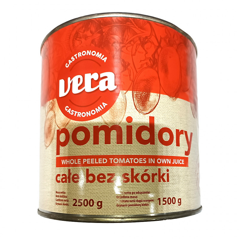 Pomidory całe 2500g/1500g VERA Idealne do przygotowywania sosów, zup oraz dań kuchni włoskiej.