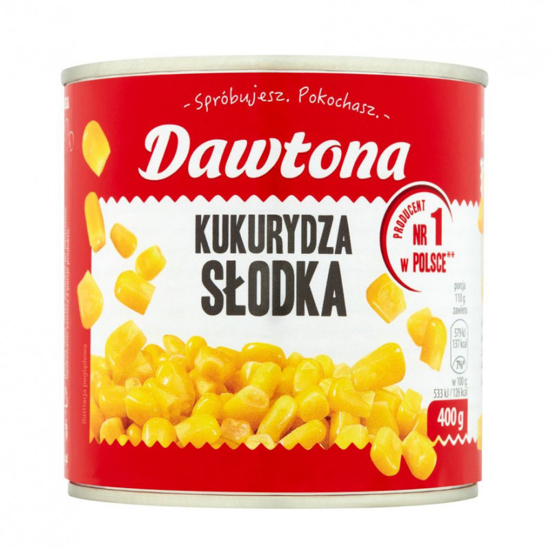 Kukurydza konserwowa 400g DAWTONA Doskonała jako dodatek do sałatek, dań głównych oraz pizzy.