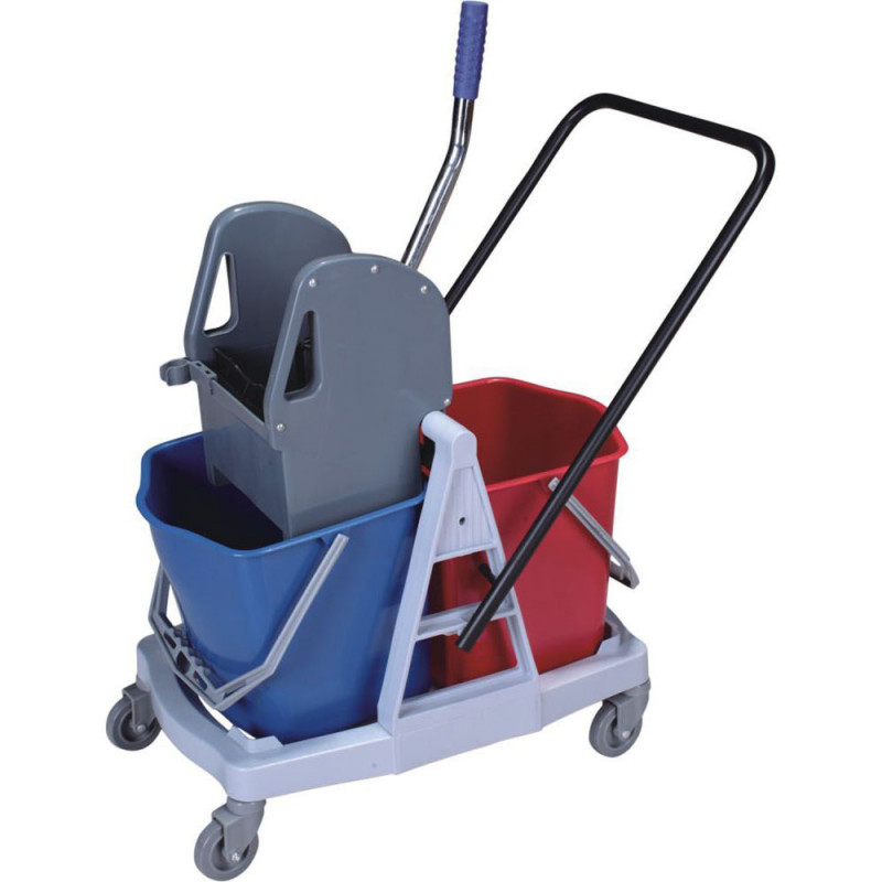 Wózek dwuwiaderkowy, materiał plastik, kolor wiaderek : niebieski, czerwony, plastikowy stelaż, pojemność wiaderek 34 l, Wymiary 71X43X93 cm